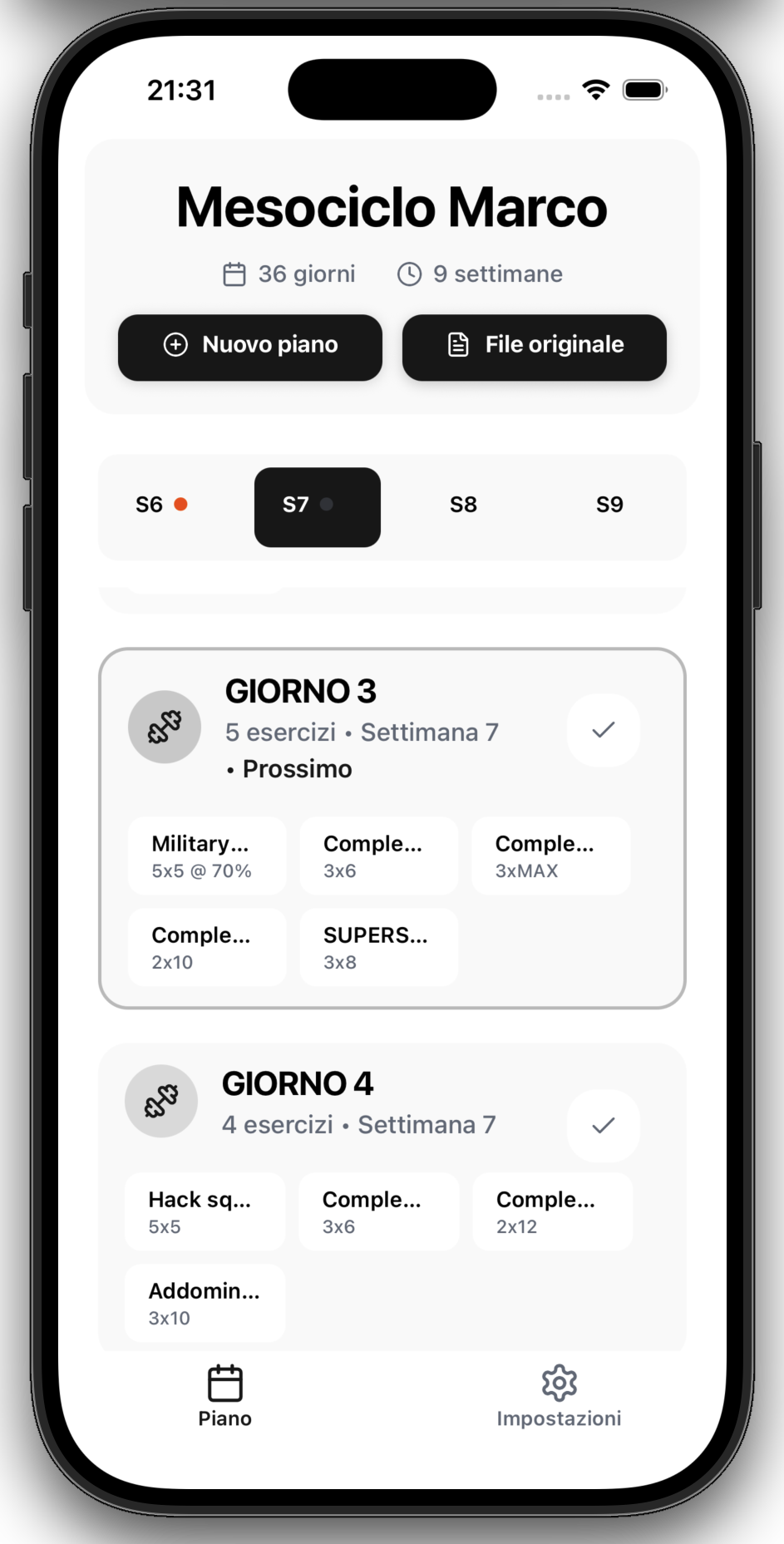 L'atleta carica il PDF che gli hai inviato. L'AI, già addestrata sul tuo formato, lo struttura perfettamente — settimane, sessioni, esercizi, serie e percentuali.
